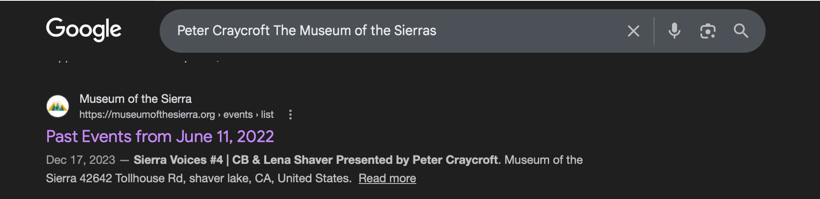 My travel in August of 2022 was to Shaver Lake and the surrounding area to do research and to make contacts for a presentation created for the Museum of the Sierra as part of its Voices of The Sierra Presentations. The presentation would occure a year later at the museum. Its goal was to find the voices of Lena and CB Shaver and to explore their lives and actions in the broader context of the Shaver Community.
